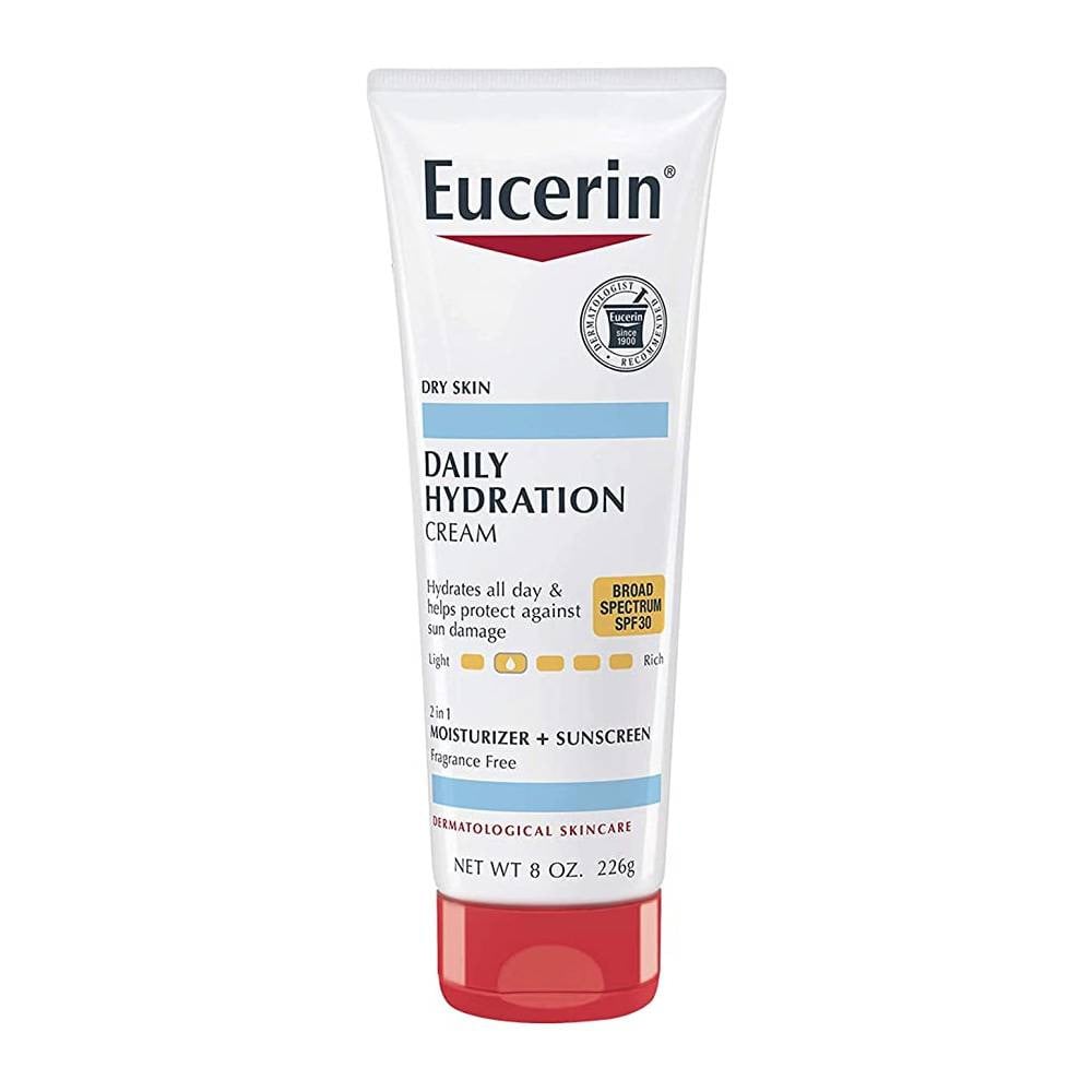 Eucerin Daily Hydration Cream Broad Spectrum SPF 30 provides 24-hour moisture to dry skin while helping to protect it from sunburn and long-term skin damage with a broad spectrum UVA/UVB sunscreen.